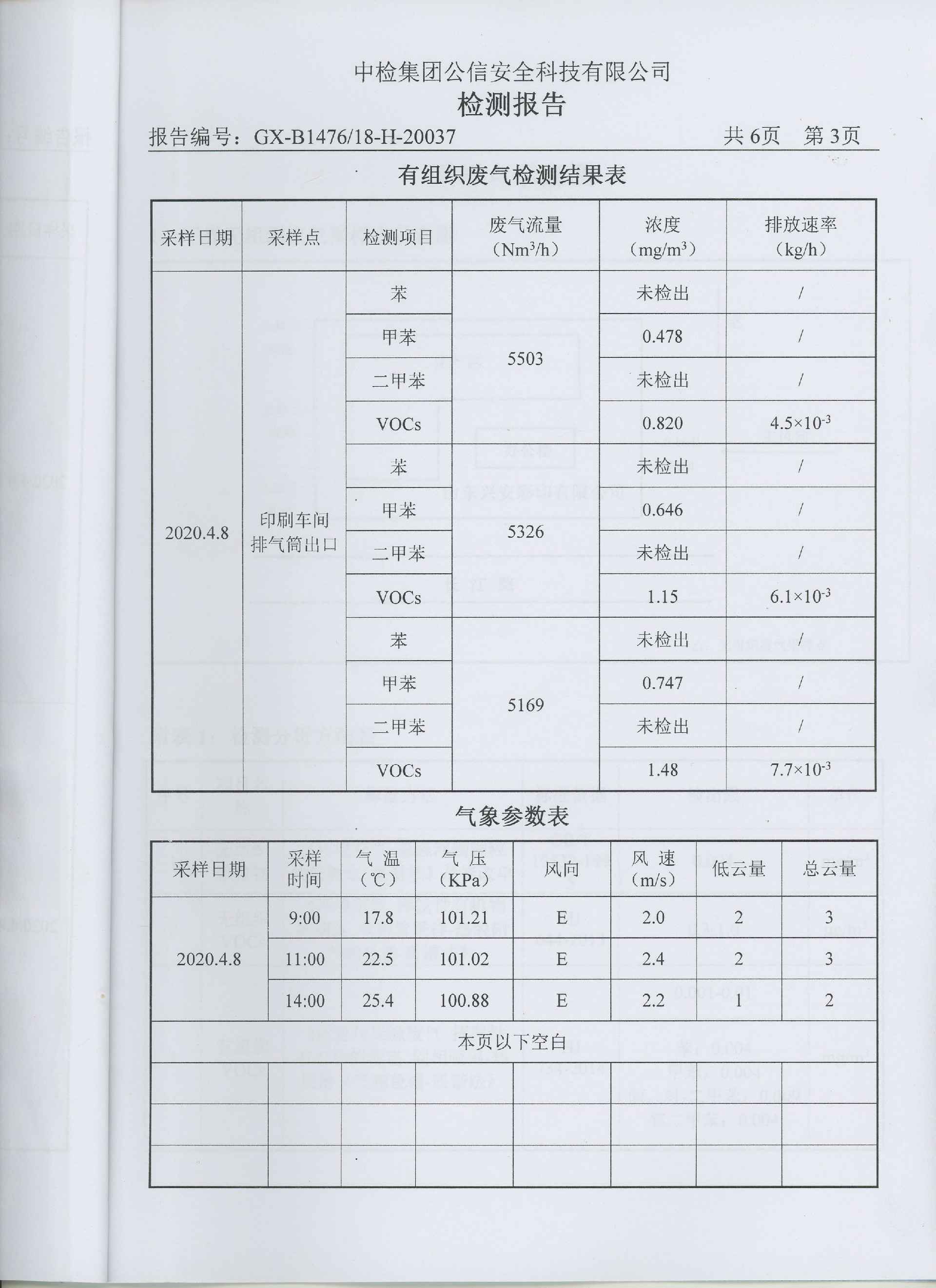 B体育平台官方网站-B体育(中国)一直把环保治理工作作为企业发展重中之重,根据市区生态环境保护局要求于2017年8月份率先上了Ⅴ0Cs环保处理设备,印刷车间废气通过收集风管,进入过滤器,将空气颗粒物过滤掉,经过光催化氧化分解剩余有机废气,同时由离子氧化进一步处理残余废气,将有机废气氧化成二氧化碳和水,通过烟囱引高排。2018年2月经有关环保专家验收合格,有机挥发物排放达标。每季度都委托枣庄公信安全科技公司对公司有机挥发物废气各项指标进行检测,下图为最新监测数据: